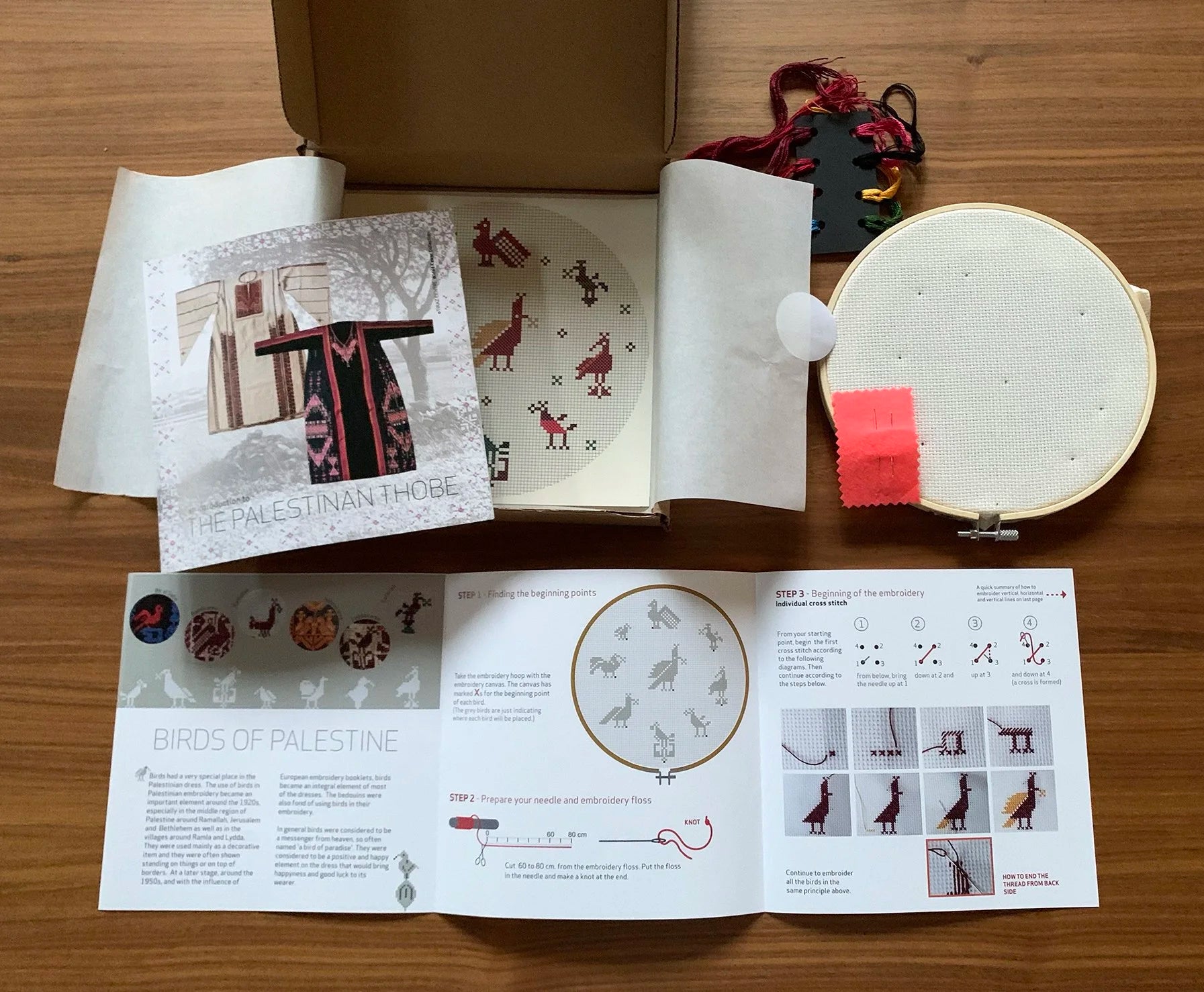 Step by step embroidery instruction manual explaining how to embroider the typical Palestinian cross fallahi stitch.